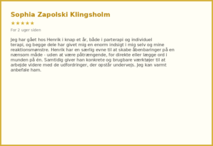 “Henrik er livsklog, lyttende og hurtig til at se ind til kernen i et menneske. Han er direkte og samtidig hensynsfuld — og rigtig god til at skabe et rum, det er trygt at åbne sig op i.”
