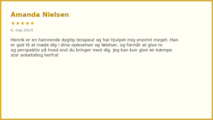 Vi har været enormt glade for forløbet og vil fortsætte med terapitimer løbende, da vi ser det som en sund investering i en selv og i parforholdet. Kæmpe anbefaling herfra.