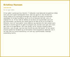 Om Biering Terapi: Jeg er uddannet psykoterapeut og parterapeut. Her på bloggen skriver jeg indlæg om parforhold, relationer, parterapi og personlig udvikling. Det er muligt at booke mig til individuel terapi og parterapi, hvis du eller dit parforhold har en krise. Jeg arbejder fra flere klinikker. Både i København og i Køge. Terapi online er også en mulighed.